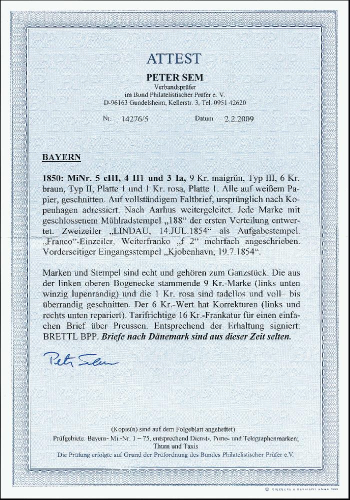 | Zusatzinformationen und Suchstichworte: | 366. Auktion Heinrich Köhler Auktionstermin 19.–24.03.2018 Los 2649 1850/58, 1 Kreuzer rosa, Platte I, 6 Kreuzer braun und 9 Kreuzer maigrün, Type III, die 9 Kreuzer unten links winzig berührt, sonst alle voll- bis überrandig, die 6 Kreuzer jedoch unten rechts und links repariert, mit gMR "188" auf kompletten Faltbrief von "LINDAU 14 JUL. 1854" nach Kopenhagen und weitergesandt nach Aarhuus mit vorderseitig nebengesetztem EKr. "KJOBENHAVN 19 7" und L1 "FRANKO"; das Weiterfranko mit "f2" mehrfach ausgewiesen; trotz der kleinen Randkorrektur der 6 Kreuzer ein seltener und attraktiver Auslandsbrief, sign. Brettl BPP und Fotoattest Sem BPP Zuschlag 500,00 EUR |