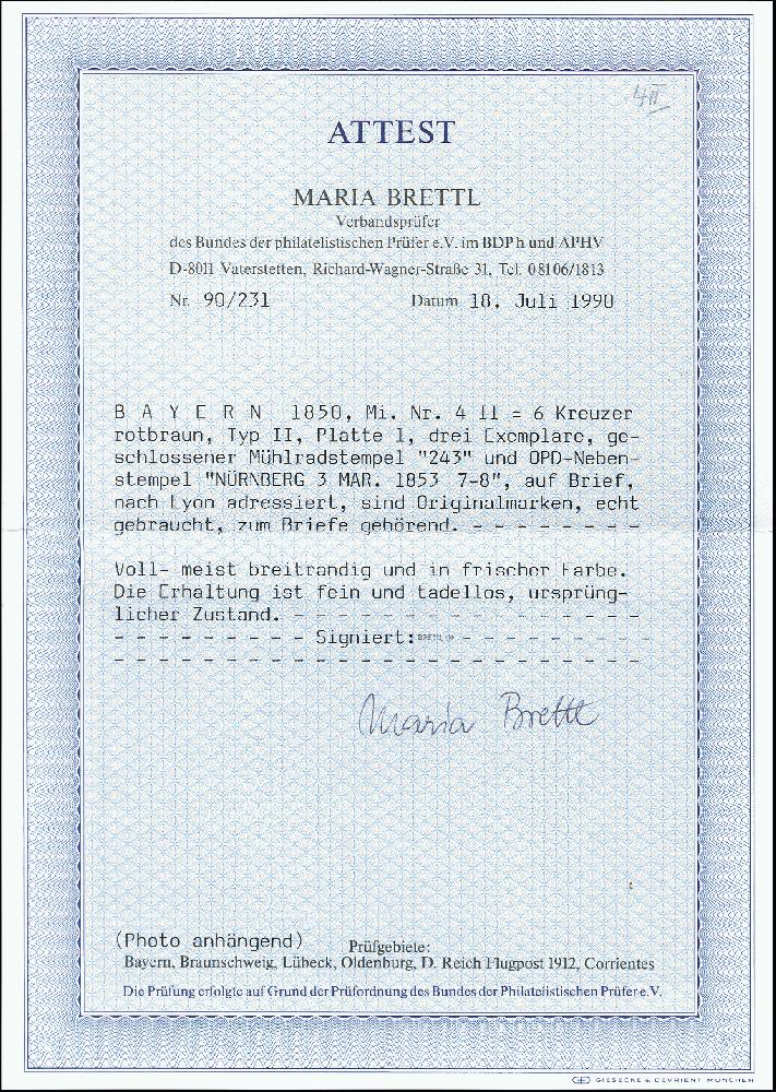 | Zusatzinformationen und Suchstichworte: | 366. Auktion Heinrich Köhler Auktionstermin 19.–24.03.2018 Los 2662 6 Kreuzer braun, 3 Einzelwerte, alle voll- bis meist breitrandig mit gMR "243" und nebengesetztem DKr. "NÜRNBERG 3 MAR. 1853" auf Faltbrief nach Lyon; Name in der Anschrift unauffällig überschrieben, sonst einwandfreie Erhaltung, signiert Brettl BPP mit Fotoattest Zuschlag 150,00 EUR |