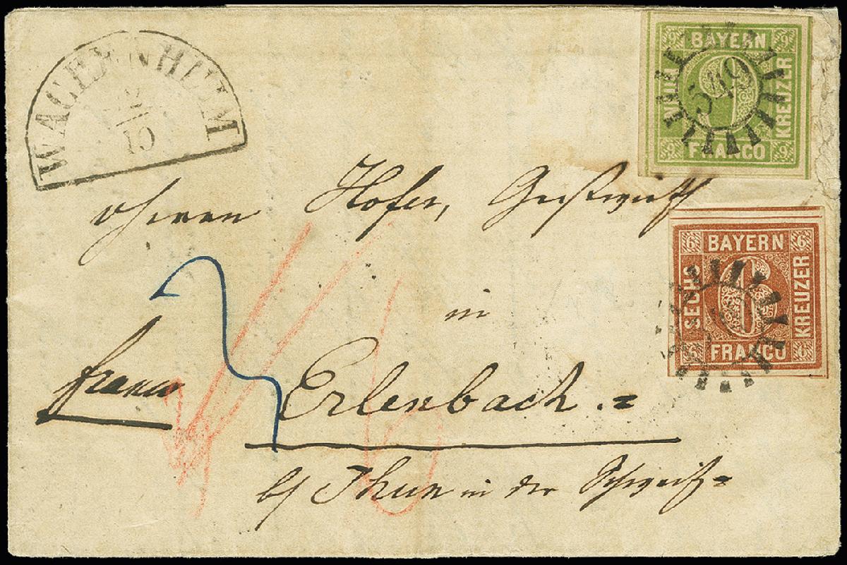 | Zusatzinformationen und Suchstichworte: | 366. Auktion Heinrich Köhler Auktionstermin 19.–24.03.2018 Los 2663 1850/58, 6 Kr. braun und 9 Kreuzer gelbgrün, beide breit- bis überrandig mit gMR "549" und nebengesetztem Halbkreisstempel "WACHENHEIM 12/19" (1860) auf kpl. Faltbrief nach Erlenbach bei Thun; 9 Kr. Vereinsporto und 6 Kr. Schweizer Anteil; der Brief am rechten Rand mit Hinterklebung eines Papierbruches, sonst einwandfrei, Fotoattest Schmitt BPP Ausruf 200,00 EUR |