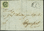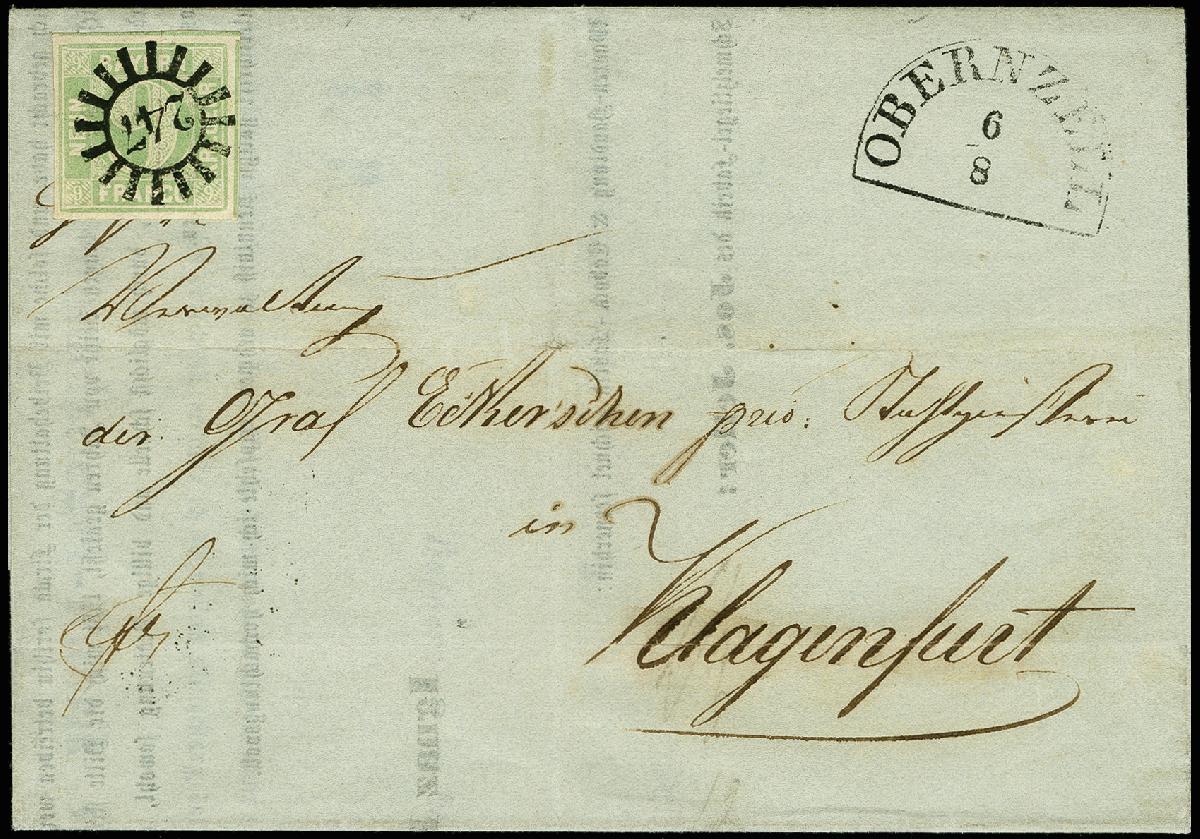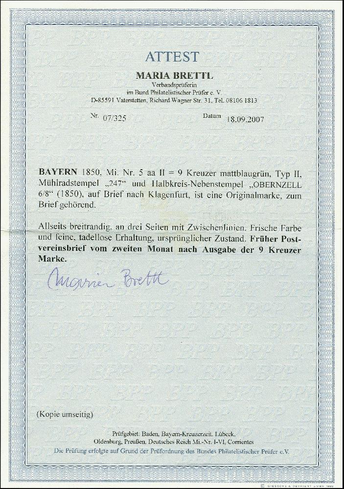 | Zusatzinformationen und Suchstichworte: | 366. Auktion Heinrich Köhler Auktionstermin 19.–24.03.2018 Los 2666 9 Kr. mattblaugrün, Typ II, allseits breitrandig mit Zwischenlinien an drei Seiten, mit klarem zentrischem gMR "247" und nebengesetztem Halbkreis "OBERNZELL 6/8" (1850) auf kpl. Faltbrief nach Klagenfurt in Österreich; ein attraktiver und recht früher Postvereinsbrief, Fotoattest Brettl BPP Zuschlag 300,00 EUR |