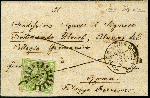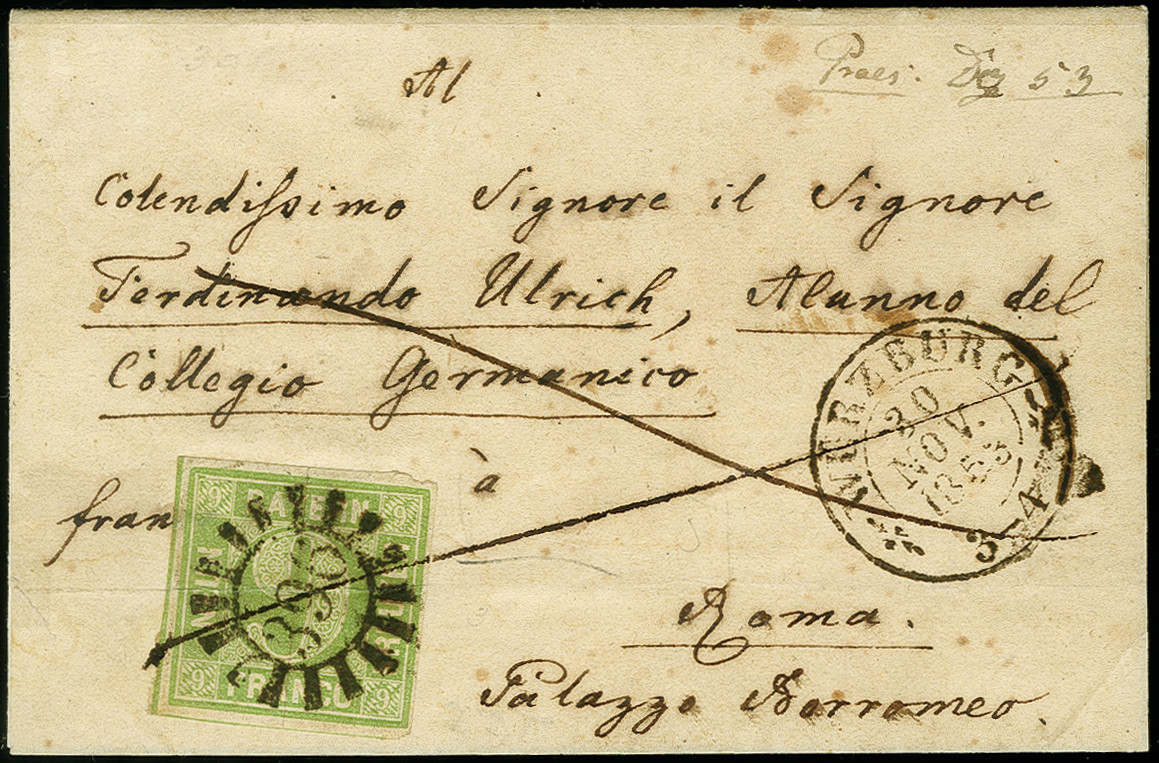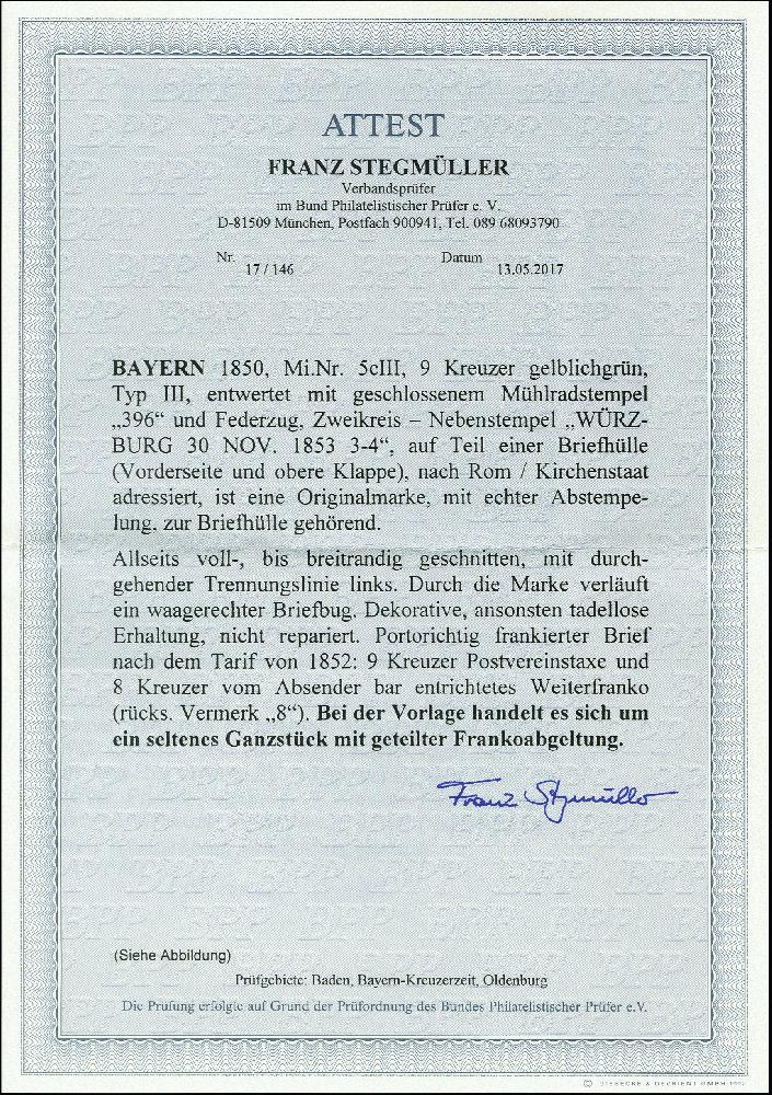 | Zusatzinformationen und Suchstichworte: | 366. Auktion Heinrich Köhler Auktionstermin 19.–24.03.2018 Los 2674 9 Kr. gelblichgrün, voll- bis breitrandig mit zentrischem gMR "396" und nebengesetztem DKr. "WÜRZBURG 30 NOV. 1853" auf Teil einer Briefhülle (Vorderseite und obere Klappe) nach Rom; der Brief ist vollständig bezahlt, 8 Kr. Weiterfranko bar entrichtet und rückseitig notiert; durch die Marke unauffälliger Briefbug, sonst einwandfrei; ein seltenes Stück mit geteilter Franko-Abgeltung, Kurzbefund M. Brettl und Fotoattest Stegmüller BPP (2017) Zuschlag 300,00 EUR |