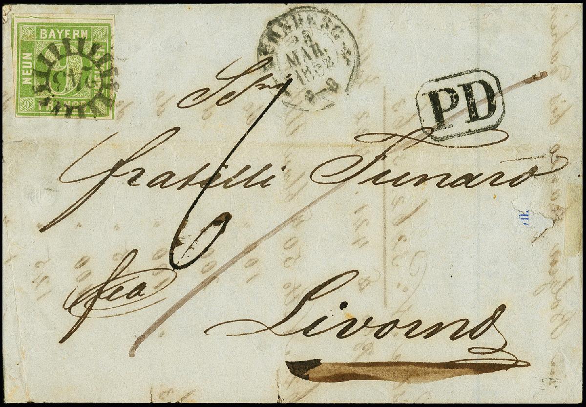 | Zusatzinformationen und Suchstichworte: | 366. Auktion Heinrich Köhler Auktionstermin 19.–24.03.2018 Los 2675 1850/58, 9 Kreuzer maigrün, voll- bis breitrandig mit gMR "243" und nebengesetztem DKr. "NÜRNBERG 25 MAR. 1852" auf nicht ganz komplettem Faltbrief nach Livorno mit nebengesetztem Ra. "PD"; der Brief war mit 15 Kreuzern vollständig bezahlt, jedoch nur das Vereinsporto verklebt, 6 Kreuzer vorderseitig als Weiterfranko vermerkt; die Briefhülle vorderseitig kleine Fehlstelle und in den Faltungen etwas schwach bzw. angetrennt; nach Toskana nur ganz wenige Briefe mit 'geteiltem Franko' bekannt, Fotoattest Brettl BPP (2009) Zuschlag 750,00 EUR |