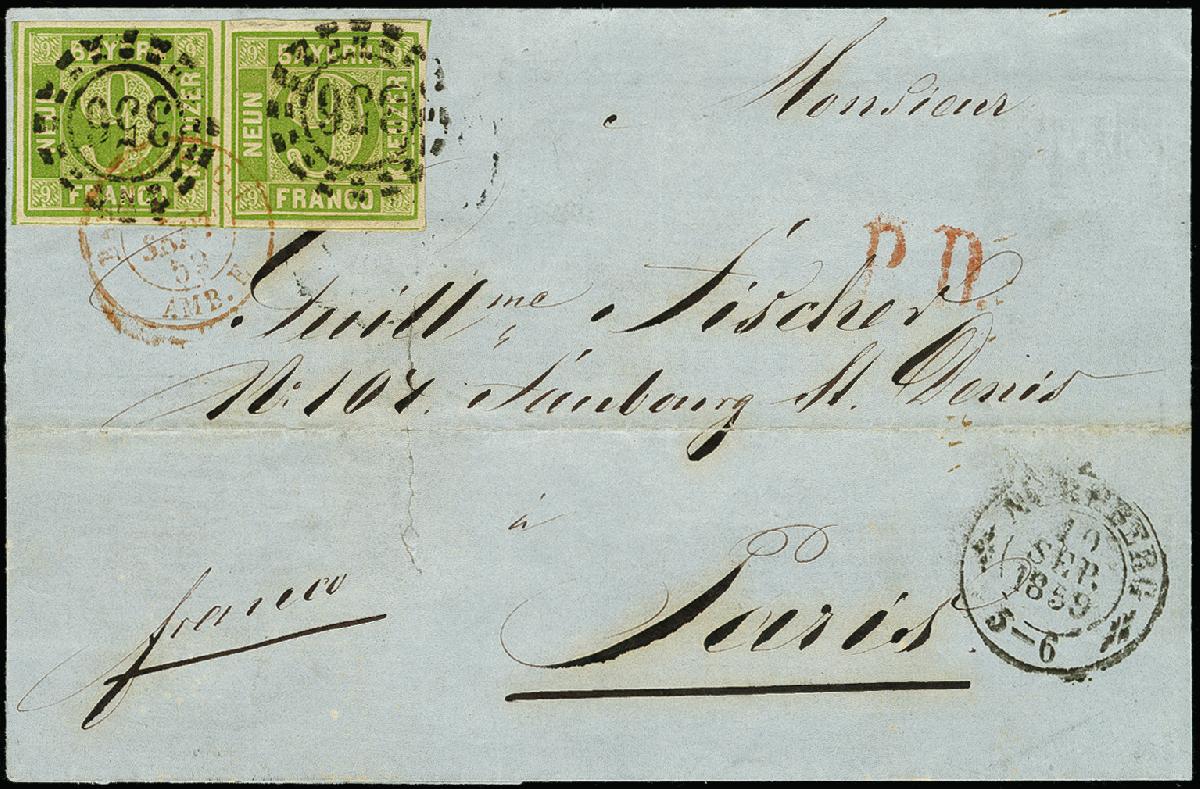 | Zusatzinformationen und Suchstichworte: | 366. Auktion Heinrich Köhler Auktionstermin 19.–24.03.2018 Los 2682 FRANKREICH: 9 Kreuzer gelbgrün, waagerechtes Paar der Typen III+II, farbfrisch und allseits breitrandig mit oMR "356" und übergehendem roten Transitstempel auf Briefhülle von "NÜRNBERG 10 FEB. 1859" nach Paris; kleiner Einriß in der Hülle vorderseitig mit Falzen hinterlegt, sonst einwandfrei, sign. und Fotoattest Brettl BPP Zuschlag 140,00 EUR |