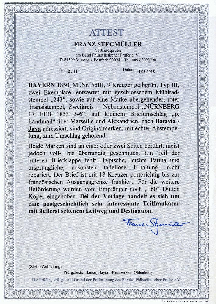| Zusatzinformationen und Suchstichworte: | 366. Auktion Heinrich Köhler Auktionstermin 19.–24.03.2018 Los 2683 9 Kr. gelbgrün, Marken teils leicht berührt aber meist voll- bis breitrandig mit jeweils glasklar aufgesetztem gMR "243" und ein Wert mit übergehendem Transitstempel, auf kleinem Briefkuvert mit DKr. "NÜRNBERG 17 FEB. 1853" mit Leitvermerken "p Landmail" und "via Marseille" nach Batavia in Niederländisch Indien mit rückseitigen Durchgangsstempeln von Marseille und des französischen Postamtes in Alexandria sowie kleinem Teil des britischen Stempels (ein größerer Teil Querverschlussklappe fehlend). Der Brief ist korrekt bis Marseille bezahlt und frankiert mit 18 Kr., den Rest der Strecke lief der Brief als Portobrief und wurde in Niederländisch Indien mit "160" Duiten Koper belastet, die vom Empfänger eingezahlt wurden. Die "Landmail" nach Niederländisch Indien konnte nach den Regularien von 1846/7 von Europa aus entweder über South Hampton oder Marseille befördert werden; war die Beförderung über Southampton bezahlt und unbezahlt möglich, so konnten Briefe über Marseille nur als Portobriefe verschickt werden. Ein attraktiver und außerordentlich seltener Brief, nicht nur aufgrund der außerordentlich seltenen Destination, sondern insbesondere aufgrund des außerordentlich seltenen Laufweges und des in dieser Form geteilten Portos, in der Köhler-Kartei ist kein vergleichbares Stück registriert. Fotoattest Stegmüller BPP (2018) Zuschlag 19.000,00 EUR |