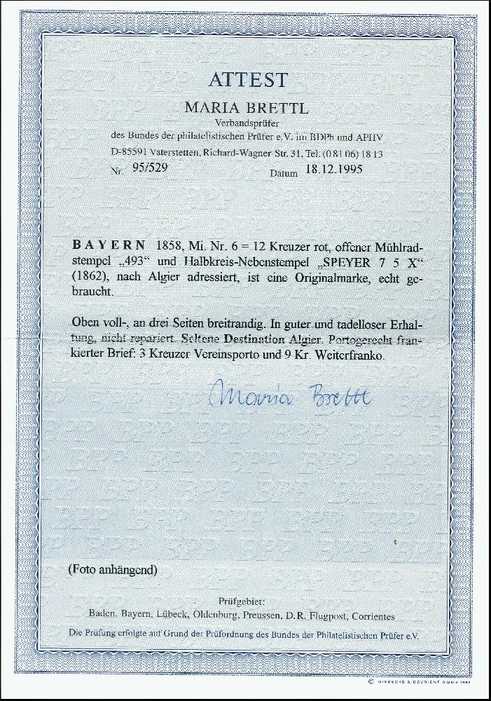 | Zusatzinformationen und Suchstichworte: | 366. Auktion Heinrich Köhler Auktionstermin 19.–24.03.2018 Los 2689 12 Kreuzer rot, farbfrisch und voll- bis breitrandig (kleine Eck-Auffaserung) mit oMR "493" und nebengesetztem Aufgabestempel "SPEYER 7 5" (1862) auf kleinem Briefkuvert via Marseille nach Algier; ein schöner und sonst einwandfreier Brief nach Nordafrika mit 3 Kreuzern Vereinsporto + 9 Kreuzer Weiterfranko; Fotoattest Brettl BPP Zuschlag 3.800,00 EUR |