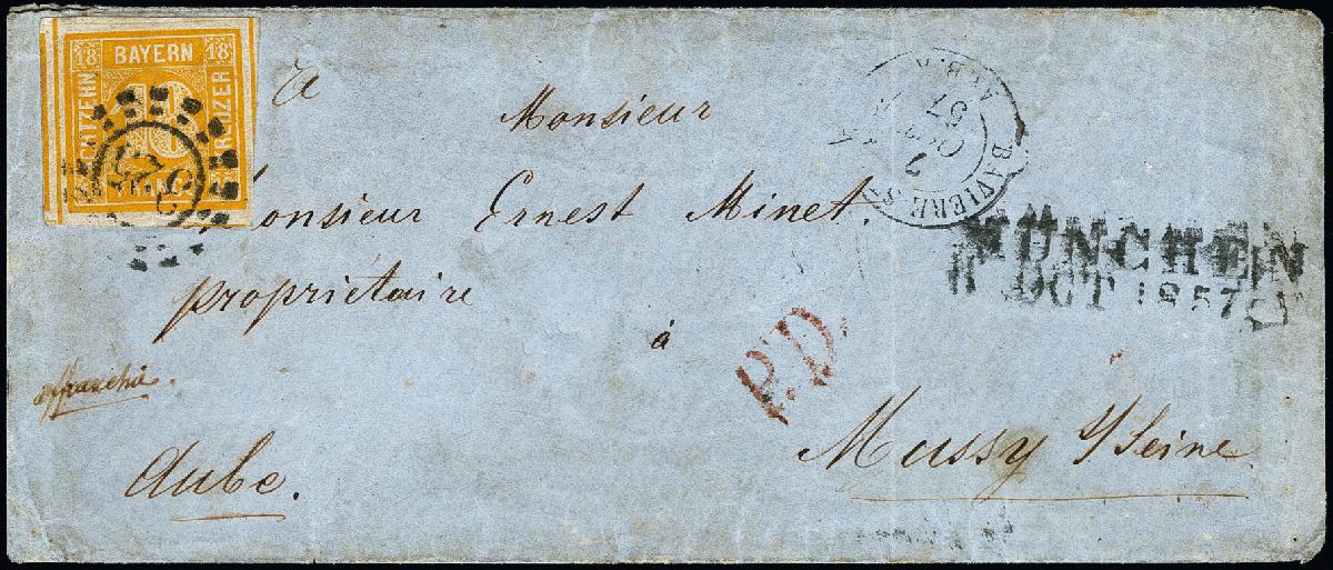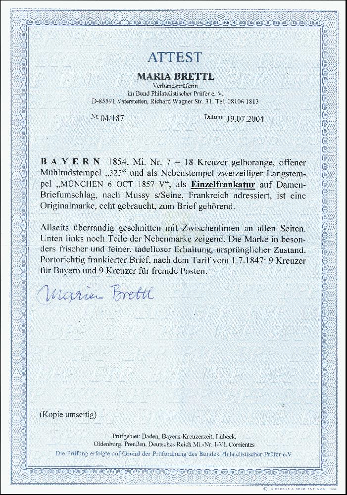 | Zusatzinformationen und Suchstichworte: | 366. Auktion Heinrich Köhler Auktionstermin 19.–24.03.2018 Los 2696 18 Kreuzer gelborange, allseits überrandig mit Zwischenlinien an allen Seiten und Teil der linken Nachbarmarke, mit oMR "325" und nebengesetztem L2 "MÜNCHEN 6 OCT: 1857" auf kleinem Briefkuvert nach Frankreich; das Kuvert etwas unfrisch, die Marke in tadelloser Erhaltung, Fotoattest Brettl BPP (2004) Zuschlag 450,00 EUR |