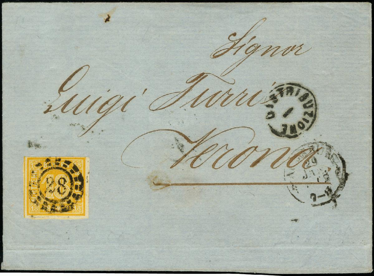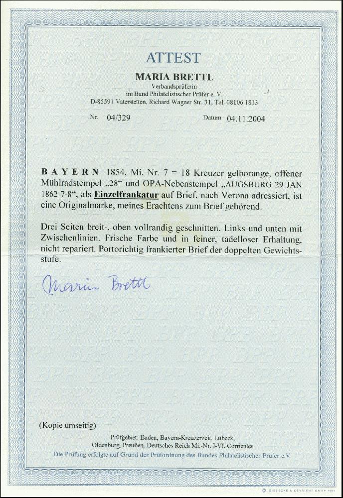 | Zusatzinformationen und Suchstichworte: | 366. Auktion Heinrich Köhler Auktionstermin 19.–24.03.2018 Los 2699 18 Kr. gelblichorange, voll- bis meist breitrandig mit zentrischem oMR "28" und nebengesetztem DKr. "AUGSBURG 29 JAN 1862" auf Briefhülle der 2. Gewichtsstufe nach Verona mit vorderseitigem Verteilungsstempel; schönes Stück in einwandfreier Erhaltung, Fotoattest Brettl BPP Ausruf 800,00 EUR |