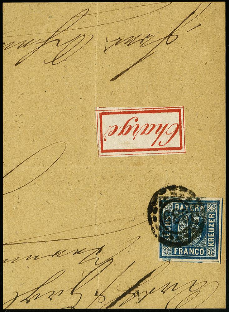 | Zusatzinformationen und Suchstichworte: | 366. Auktion Heinrich Köhler Auktionstermin 19.–24.03.2018 Los 2735 6 Kr. blau, voll- bis breitrandig mit oMR "389" PFAFFENHOFEN auf großem Briefteil mit neben geklebten Klebezettel "Chargé"; diese frühen und vermutlich privat angefertigten Chargé-Zettel sind außerordentlich selten, laut Fotoattest Brettl BPP (2000) sind ihr bis dato drei Briefe und zwei weitere Briefstücke bekannt Zuschlag 500,00 EUR |