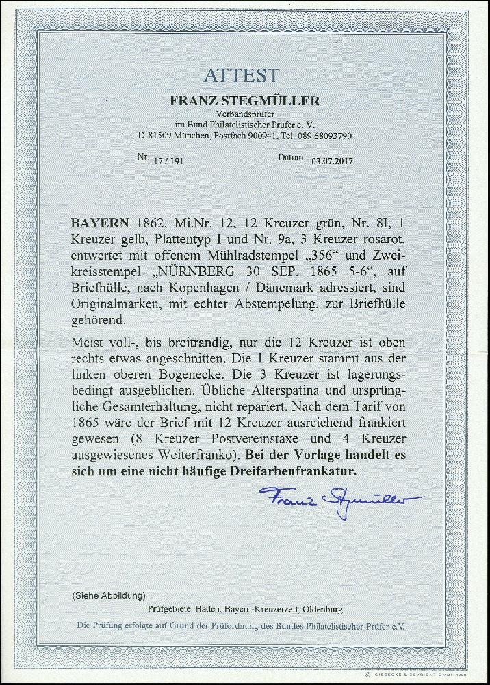 | Zusatzinformationen und Suchstichworte: | 366. Auktion Heinrich Köhler Auktionstermin 19.–24.03.2018 Los 2745 12 Kr. grün, 1 Kr. gelb und 3 Kr. rosa, letztere verblasst, sonst farbfrisch und alle voll- bis breitrandig mit gMR "356" bzw. DKr. "NÜRNBERG 30 SEP. 1865" auf Briefhülle nach Kopenhagen, Dänemark, noch frankiert nach dem alten Tarif von 1854; insgesamt leichte Patina, sonst gute Erhaltung; ein seltener Auslandsbrief, Fotoattest Stegmüller BPP Zuschlag 500,00 EUR |