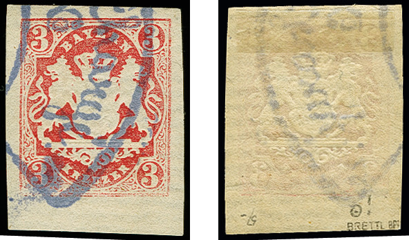 | Zusatzinformationen und Suchstichworte: | 366. Auktion Heinrich Köhler Auktionstermin 19.–24.03.2018 Los 2766 3 Kr. rosa auf wasserzeichenähnlichem waagerecht gestreiftem Papier, allseits sehr breitrandig, unten mit 4/5 mm Bogenrand, sauber entwertet durch Fächerstempel "Chargé No."; ein ganz außergewöhnliches Stück, sign. Brettl BPP und Fotoattest Stegmüller BPP Zuschlag 2.000,00 EUR |