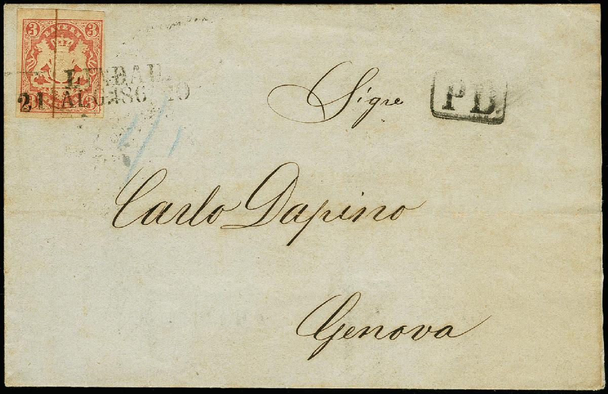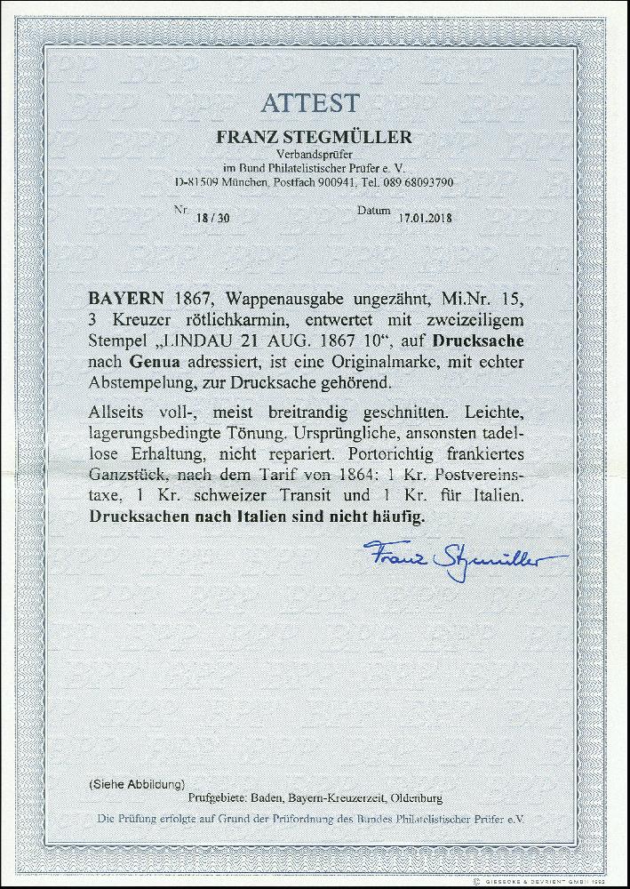 | Zusatzinformationen und Suchstichworte: | 366. Auktion Heinrich Köhler Auktionstermin 19.–24.03.2018 Los 2771 3 Kr. rötlichkarmin, voll- bis breitrandig mit L2 "LINDAU 21 AUG. 1867" auf kpl. Auslandsdrucksache über die Schweiz nach Genua mit Transit- und Ankunftsstempeln; lagerungsbedingte geringe Tönung, sonst einwandfrei; eine seltene Auslandsdrucksache, Fotoattest Stegmüller BPP Ausruf 300,00 EUR |