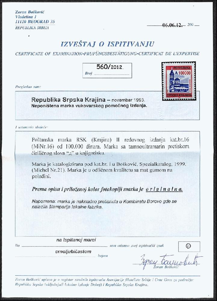 | Zusatzinformationen und Suchstichworte: | 55. SFK Auktion 22. - 23. Oktober 2022 Los 1383 Kroatien 1993. Vukovarsko pomoćno izdanje 100.000d sa PRETISKOM ĆIRILIČNOG SLOVA "D" u knjigotisku doštampavanje u kombinatu Borovo. Atest Bošković. Odličan kvalitet. 1993 Vukovar auxiliary edition 100.000d with OVERPRINT OF CYRILLIC LETTER "D" in reset printing in Borovo factory. Certificate Boskovic. VF Ausruf 50,00 EUR |