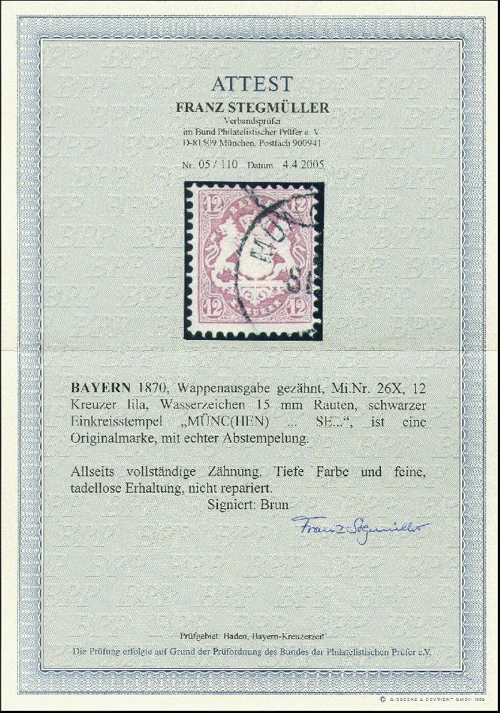 | Zusatzinformationen und Suchstichworte: | 366. Auktion Heinrich Köhler Auktionstermin 19.–24.03.2018 Los 2791 12 Kr. lila mit EKr. "MÜNCHEN", Kabinett, sign. Brun, Fotoattest Stegmüller BPP (2005) Zuschlag 280,00 EUR |