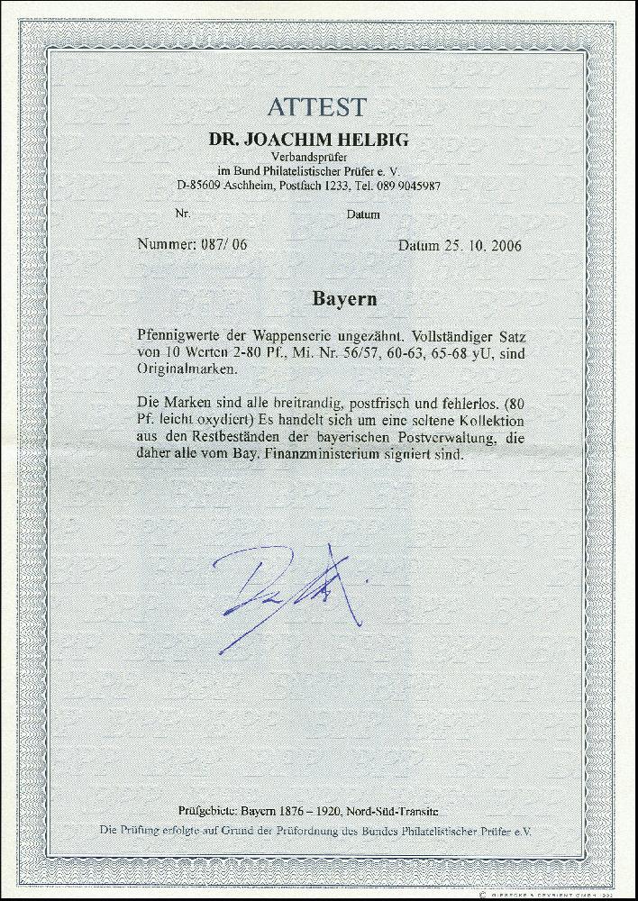 | Zusatzinformationen und Suchstichworte: | 366. Auktion Heinrich Köhler Auktionstermin 19.–24.03.2018 Los 2797 1888/1900, Staatswappen 2-80 Pfennig, alle breitrandig ungezähnt, postfrisch, 80 Pfennig leicht oxidiert, sonst tadellos, Fotoattest Helbig BPP (2006) Ausruf 250,00 EUR |
