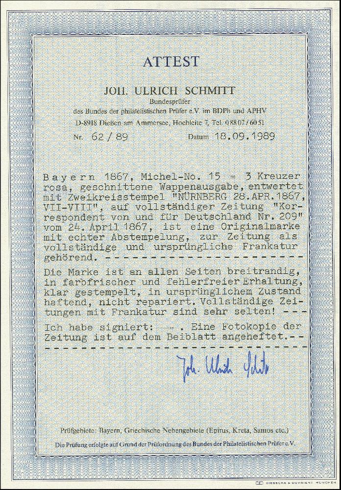 | Prüfer: | Schmitt, Joh. Ulrich (BPP (Bund Philatelistischer Prüfer)) |