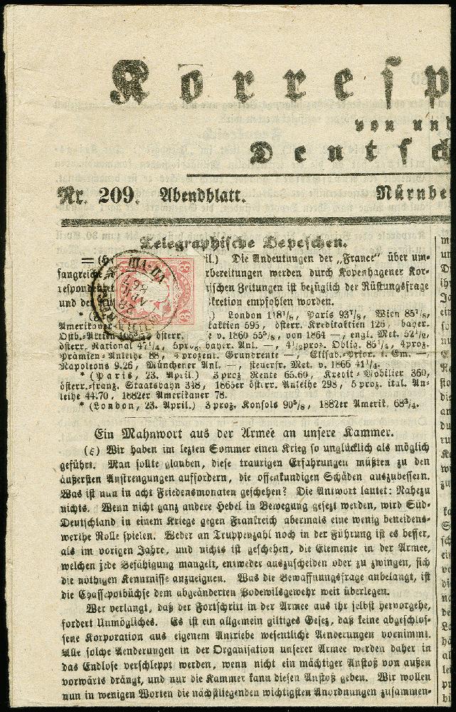 | Zusatzinformationen und Suchstichworte: | 366. Auktion Heinrich Köhler Auktionstermin 19.–24.03.2018 Los 2798 1867, 'Korrespondent von und für Deutschland' frankiert mit 1867, Wappen 3 Kr. rosa, voll- bis breitrandig mit übergehendem DKr. "NÜRNBERG 28 APR. 1867", einwandfrei, Streifband entfernt; eine in dieser Form sehr seltene und attraktive Frankatur, sign. Schmitt BPP mit Fotoattest Zuschlag 750,00 EUR |