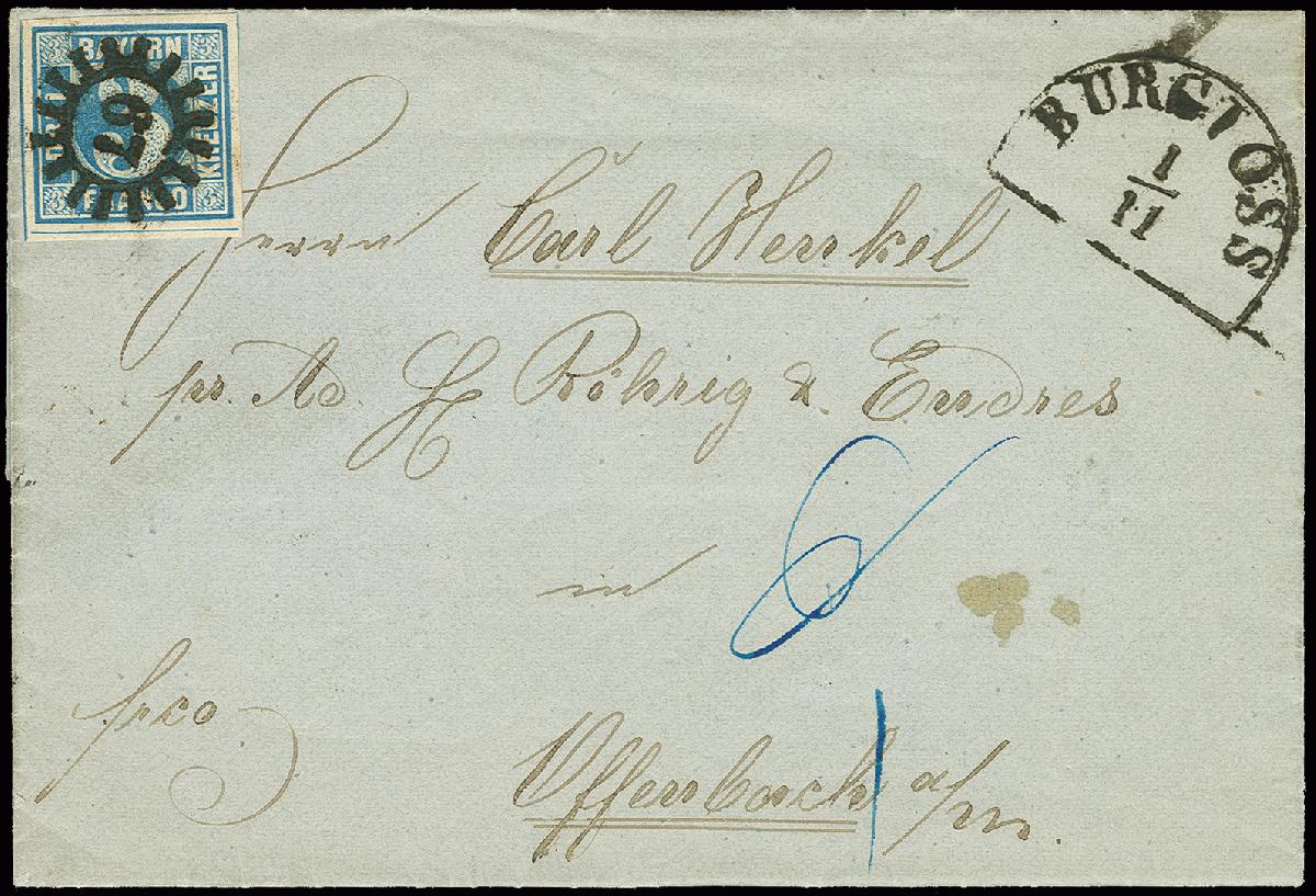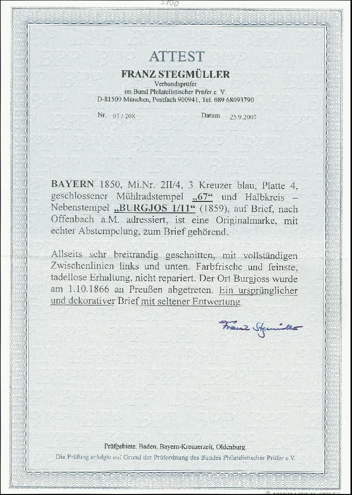 | Zusatzinformationen und Suchstichworte: | 366. Auktion Heinrich Köhler Auktionstermin 19.–24.03.2018 Los 2841 "67" BURGJOSS, klar und zentrisch auf 3 Kr. blau, Platte 4, allseits breitrandig auf kpl. Faltbrief mit sauber nebengesetztem Halbkreisstempel vom 1.11.1859 nach Offenbach; ein seltener und attraktiver Brief des 1866 an Preußen abgetretenen Postortes in tadelloser Erhaltung, Fotoattest Stegmüller BPP (2007) Zuschlag 750,00 EUR |