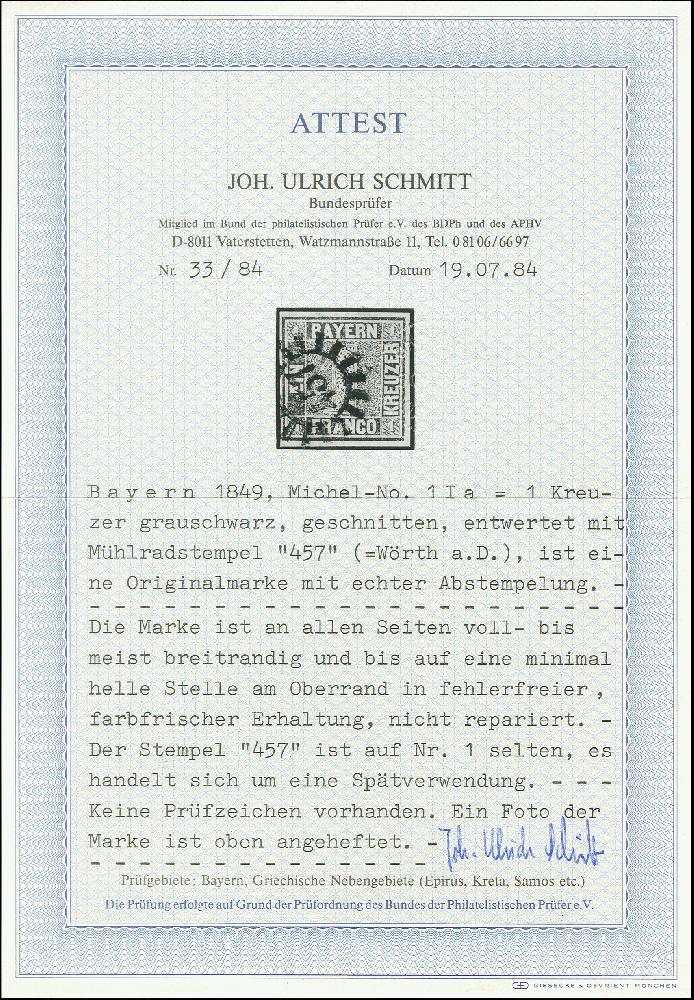 | Zusatzinformationen und Suchstichworte: | 366. Auktion Heinrich Köhler Auktionstermin 19.–24.03.2018 Los 2862 "457" WÖRTH a. D., sauber auf 3 Kr. grauschwarz, voll- bis meist breitrandig und bis auf eine minimale helle Stelle am Oberrand einwandfrei; eine auf dieser Marke seltene Entwertung (Postexpedition Juli 1851 eröffnet), Fotoattest Schmitt BPP Ausruf 700,00 EUR |