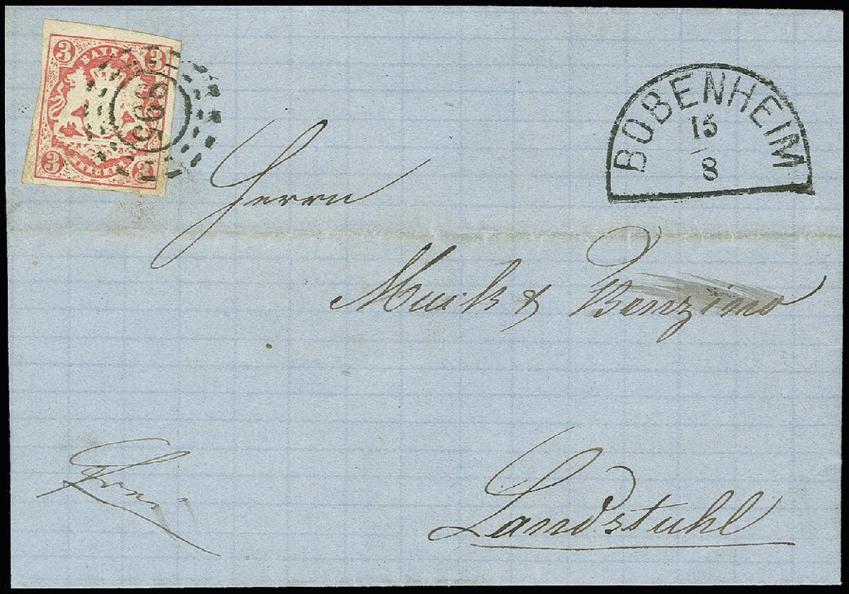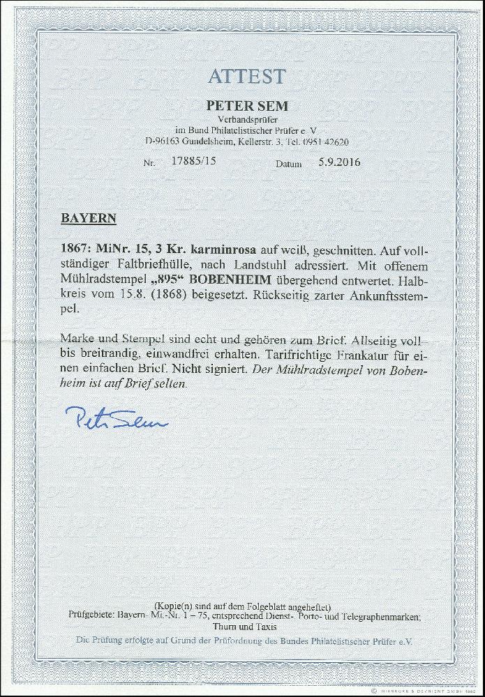 | Zusatzinformationen und Suchstichworte: | 366. Auktion Heinrich Köhler Auktionstermin 19.–24.03.2018 Los 2914 "895" BOBENHEIM, sauber auf Wappen 3 Kr. rosa, voll- bis breitrandig mit sauber nebengesetztem Halbkreisstempel auf Briefhülle 1868 nach Landstuhl; ein attraktiver Brief dieses selten dokumentierten Postortes, Fotoattest Sem BPP Ausruf 600,00 EUR |