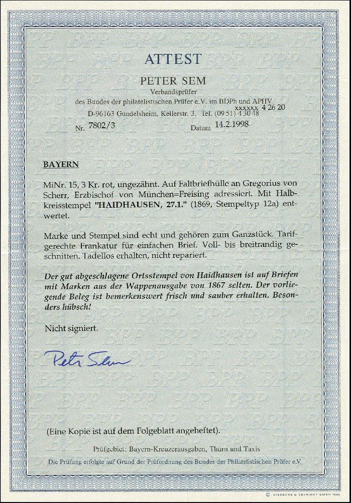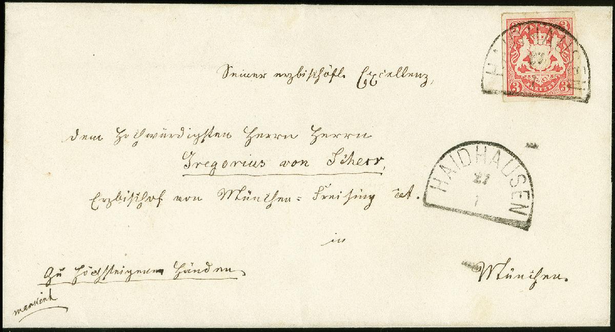 | Zusatzinformationen und Suchstichworte: | 366. Auktion Heinrich Köhler Auktionstermin 19.–24.03.2018 Los 2936 "HAIDHAUSEN 27/1", sauber auf- und nebengesetzt auf Wappen 3 Kr. rosa, allseits breitrandig auf handschriftlichem Bischofsbrief(hülle) an Gregorius von Scherr in München, Kabinett, Fotoattest Sem BPP (1998) Zuschlag 200,00 EUR |