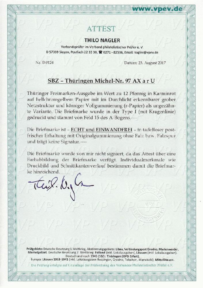 | Zusatzinformationen und Suchstichworte: | ebay.de ArtNr.:409 - SBZ Thüringen Mi-Nr. 97 AX a r U postfrisch Attest und Verkäufer Nagler VP absolute Rarität Die Erhaltung und Vollständigkeit ist wie abgebildet. Sofortkauf 14.000,00 EUR |