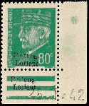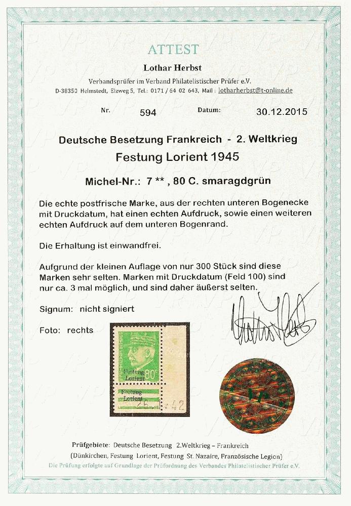 | Zusatzinformationen und Suchstichworte: | ebay.de 6493) Frankreich - Festung Lorient Mi.-Nr. 7 Bru postfrisch Fotoattest Herbst VP 80 C. Freimarke grün mit Aufdruck "Festung Lorient" mit zusätzlichem Aufdruck auf dem Bogenrand, Eckrand unten rechts (Feld 100) mit Druckdatum "26.1.42" der Urmarke, tadellos postfrisch, unsigniert, Fotoattest Lothar Herbst VP (2015): "Die Erhaltung ist einwandfrei. Aufgrund der kleinen Auflage von nur 300 Marken sind diese sehr selten. Marken mit Druckdatum (Feld 100) sind nur ca. 3 mal möglich und sind daher äußerst selten." Sofortkauf 2.625,00 EUR |