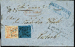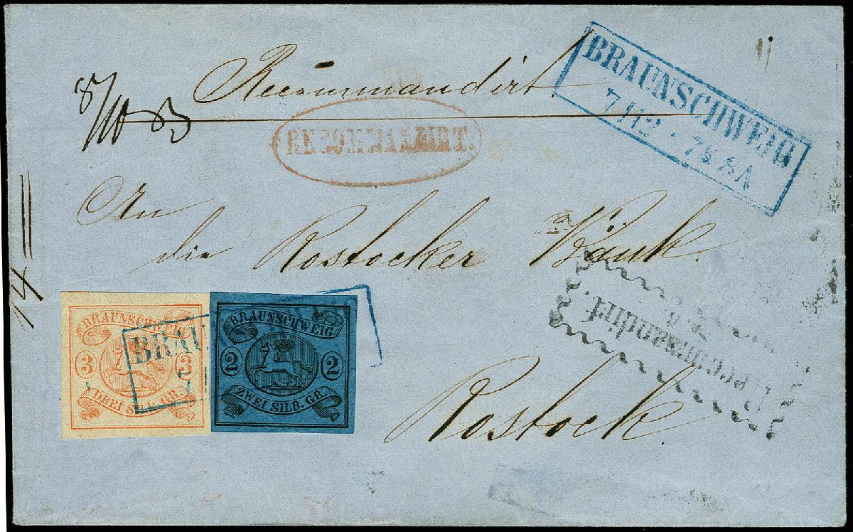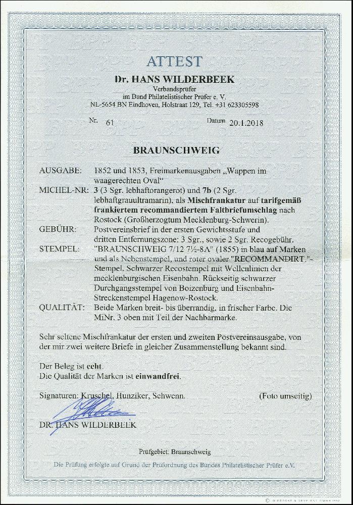 | Zusatzinformationen und Suchstichworte: | 366. Auktion Heinrich Köhler Auktionstermin 19.–24.03.2018 Los 2949 3 Sgr. rotorange in Mischfrankatur mit 1853, 2 Sgr. auf hellblau, beide sehr schön farbfrisch und allseits breitrandig, die 3 Sgr. oben mit kleinem Teil der Nachbarmarke, mit klar auf- sowie nebengesetztem blauen Ra2 "BRAUNSCHWEIG 7/12" (1855) auf rekommandierter Briefhülle nach Rostock mit rotem Ovalstempel "RECOMMANDIRT" sowie schwarzem "Recommandirt. Sp.B" der mecklenburgischen Eisenbahn. Eine sehr seltene Mischfrankatur in traumhafter Erhaltung, der schönste der 3 bekannten Briefe mit dieser Kombination, sign. Hunziker, Kruschel und Schwenn sowie Fotoattest Dr. Wilderbeek BPP (2018) Provenienz: Anderegg (Schwenn 1966) Zuschlag 11.000,00 EUR |