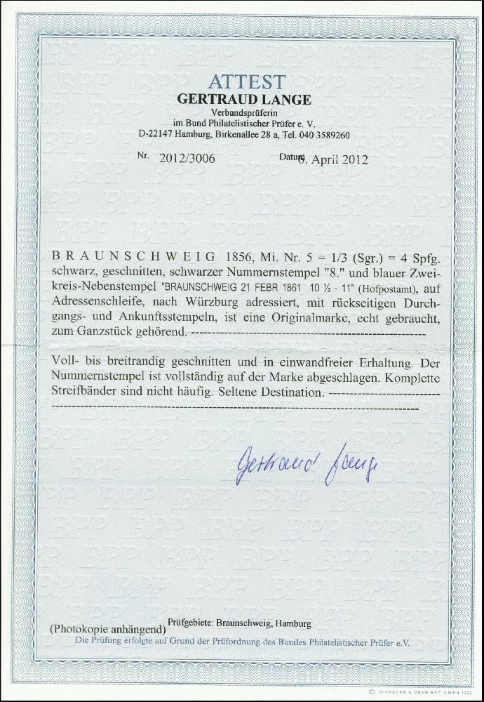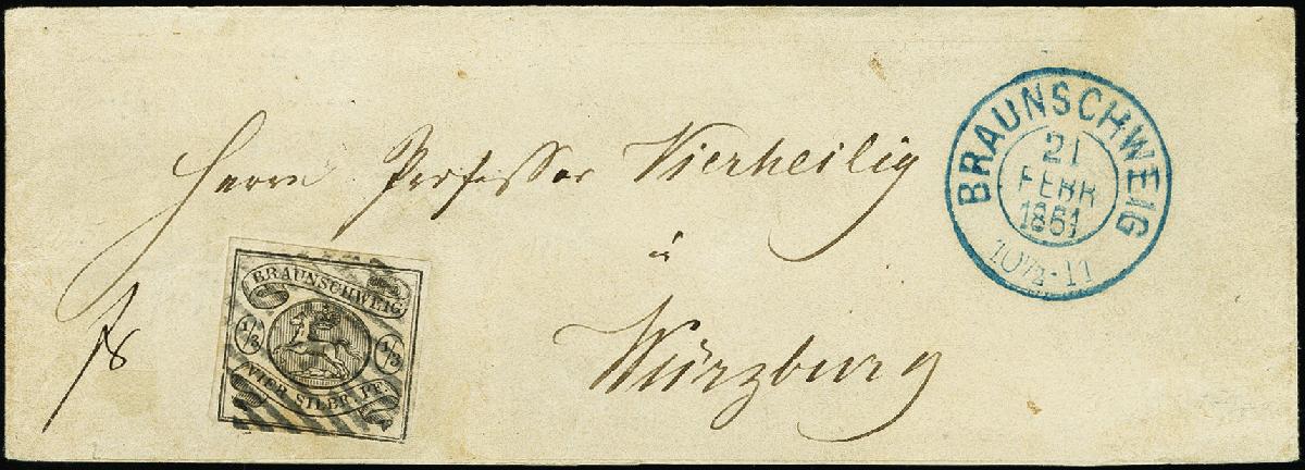 | Zusatzinformationen und Suchstichworte: | 366. Auktion Heinrich Köhler Auktionstermin 19.–24.03.2018 Los 2950 1/3 Sgr. schwarz, rechts unten noch voll- sonst breitrandig mit klar aufgesetzter Nr. "8" auf vollständigem Streifband mit nebengesetztem blauen DKr. "BRAUNSCHWEIG 21 FEBR 1861" nach Würzburg mit Transit- und Ankunftsstempeln; eine attraktive und seltene Einzelfrankatur dieser Marke, Fotoattest Lange BPP Zuschlag 800,00 EUR |