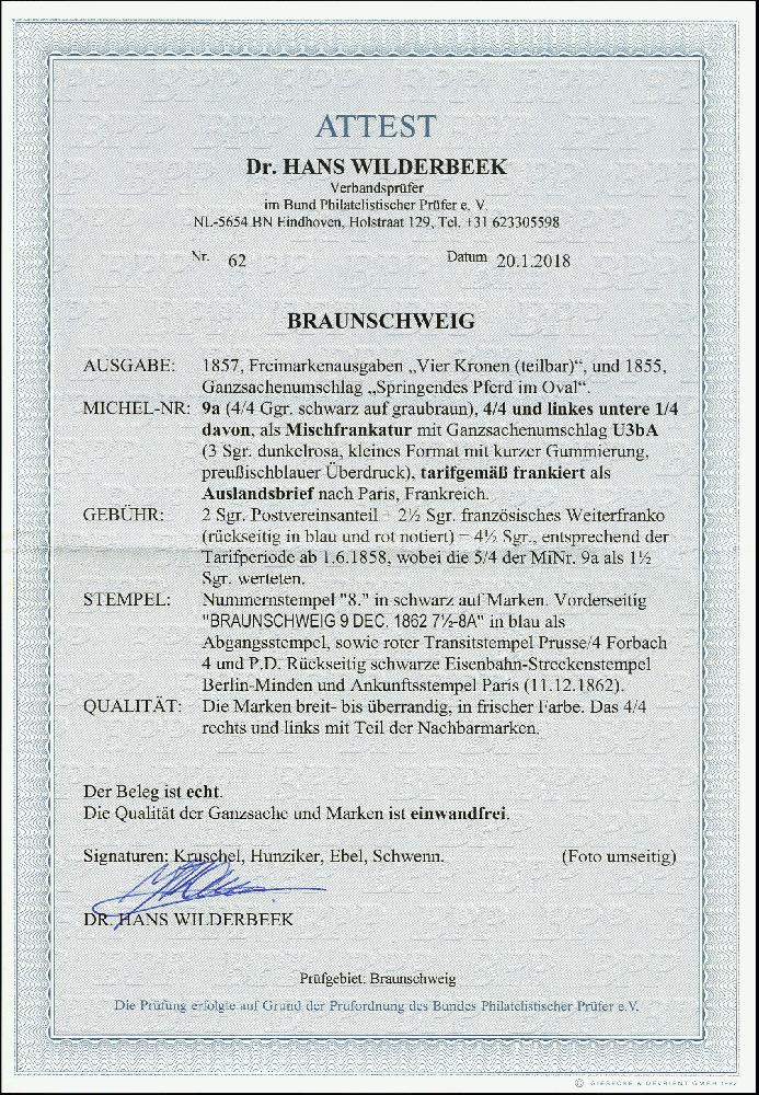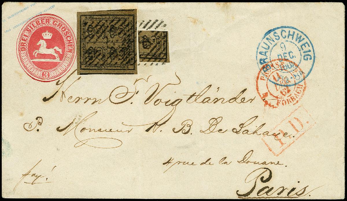 | Zusatzinformationen und Suchstichworte: | 366. Auktion Heinrich Köhler Auktionstermin 19.–24.03.2018 Los 2952 4/4 Ggr. und ¼ Ggr. auf graubraun, beide breit- bis überrandig mit Nr. "8" als Zufrankatur auf Ganzsachenumschlag 3 Sgr. rosa mit blauem DKr. "BRAUNSCHWEIG 9 DEC. 1862" nach Paris mit Transit- und Ankunftsstempeln. Das Porto setzt sich zusammen aus 2 Sgr. Postvereinsanteil und 2½ Sgr. Weiterfranko (rückseitig in blau notiert), wobei die Inlandsmarken als 1½ Sgr. verrechnet wurden; leichte Bugspuren außerhalb der Frankatur, sonst einwandfrei; ein mit dieser Frankaturkombination außerordentlich seltener Auslandsbrief, u.a. sign. Kruschel und Schwenn sowie Fotoattest Dr. Wilderbeek BPP (2018) Zuschlag 3.800,00 EUR |