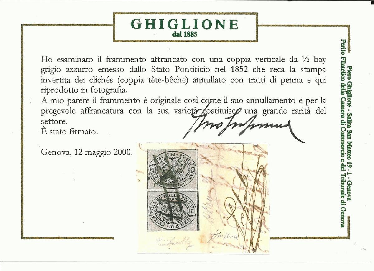 | Zusatzinformationen und Suchstichworte: | Il Ponte 573. Auktion, Briefmarken 19. September 2022 Los 13 Italien Staaten Kirchenstaat STATO PONTIFICIO 1852 Varietà. Frammento di lettera con coppia tête-bêche del ½b. grigio azzurro Cert. P. Ghiglione. Firma A. Diena Ausruf 5.000,00 EUR |