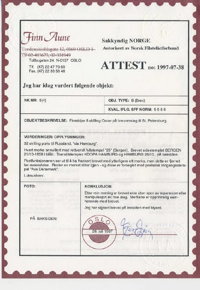| Zusatzinformationen und Suchstichworte: | Postiljonen 237. Int. Briefmarken Auktion 29. September - 01. Oktober 2022 Los 407 Norwegen Skilling Oskar An absolutely wonderful cover to Russia with 8 sk. in strip of four. Each stamp with an excellent canc. "25". Ex. Nyman. Cert. Aune. EXCELLENT ITEM (5, 5, 5, 5) Zuschlag 1.300,00 EUR |