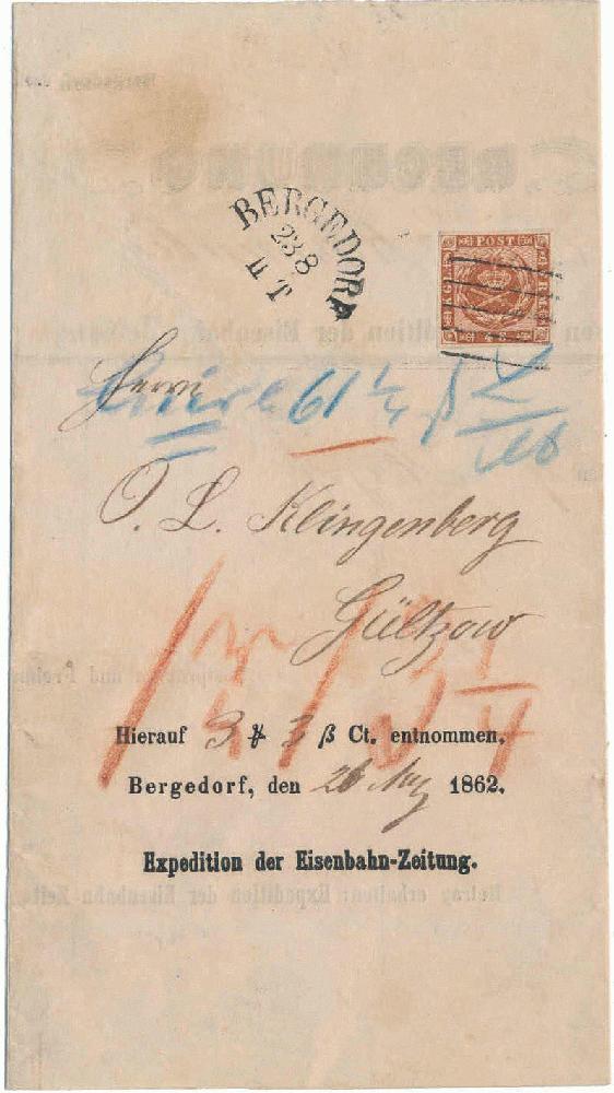 | Zusatzinformationen und Suchstichworte: | Postiljonen 237. Int. Briefmarken Auktion 29. September - 01. Oktober 2022 Los 95 Dänemark A beautiful COD Receipt sent from "BERGEDORF 23.8" (1862) to Gültzow in Lauenburg. Franked with 4 skilling 4th printing canc. with 5-bars canc. Cert. Jørgensen. RARE IN THIS QUALITY. EXCELLENT Ausruf 1.200,00 EUR |