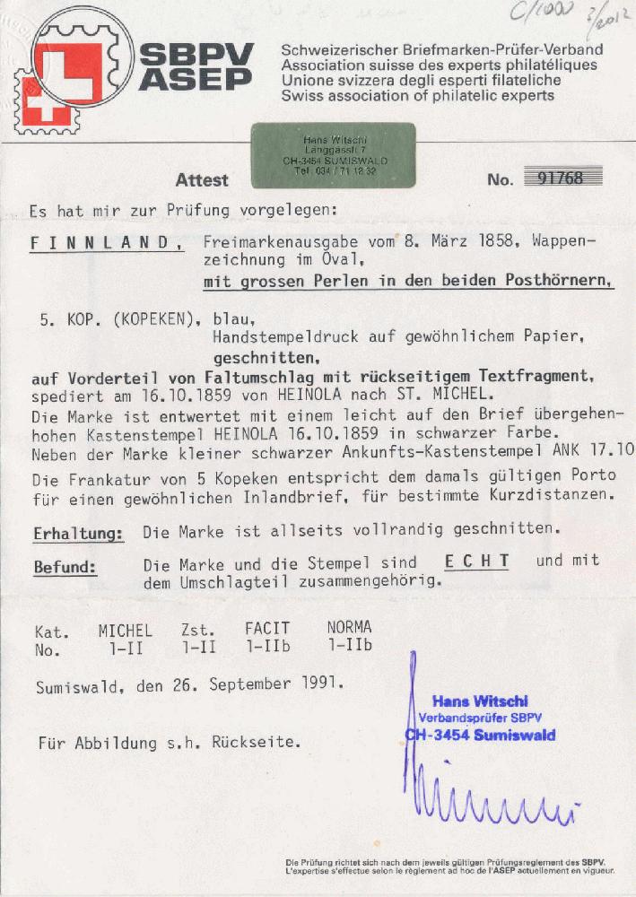 | Zusatzinformationen und Suchstichworte: | Postiljonen 237. Int. Briefmarken Auktion 29. September - 01. Oktober 2022 Los 435 Finnland 1856 1. Ausgabe Large part of cover front 5 kopek blue large pearls with good margins all around and canc. with the scarcer high box "HEINOLA 16.10 1859". Cert. Witschi. VERY FINE. Zuschlag 1.100,00 EUR |