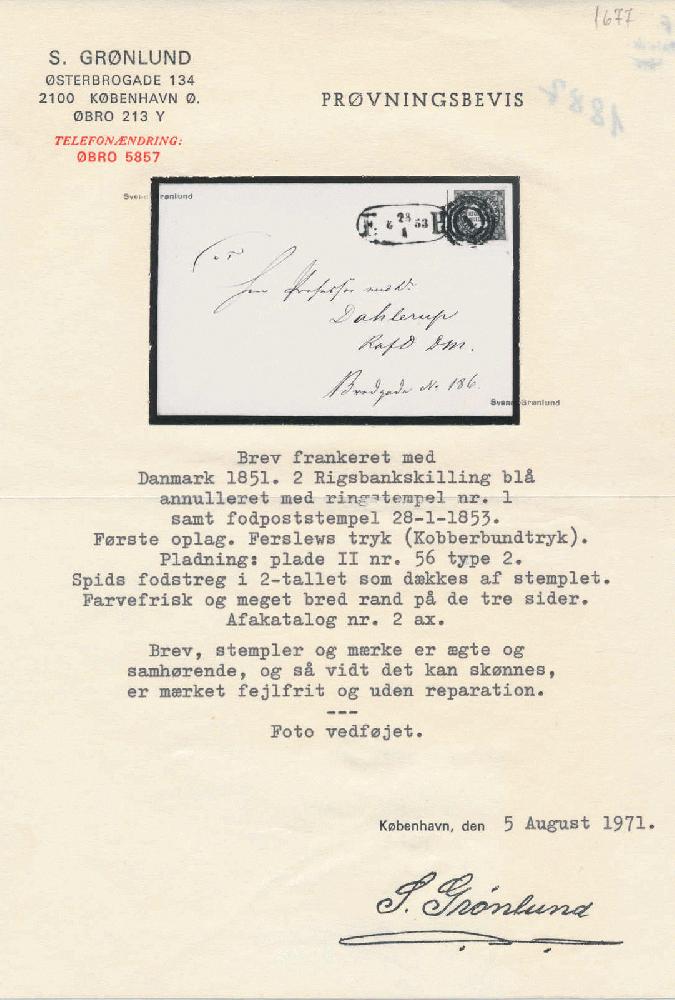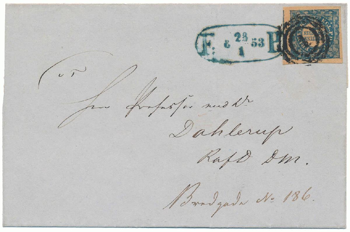 | Zusatzinformationen und Suchstichworte: | Postiljonen 237. Int. Briefmarken Auktion 29. September - 01. Oktober 2022 Los 527 Dänemark 2 Rigsbank Skilling Disjoined foot of "2" and numeral canc. "1" on a beautiful cover with 2 RBS Ferslew plate II No. 56 type 2. Upright blue "F:P: 28.1 53" (late use of Ferslew stamp). Three very wide margins. Certs Grønlund, Møller and Lasse Nielsen. SUPERB. Zuschlag 2.500,00 EUR |