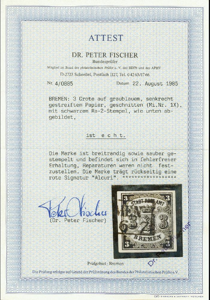 | Zusatzinformationen und Suchstichworte: | 366. Auktion Heinrich Köhler Auktionstermin 19.–24.03.2018 Los 2958 3 Gr. auf blaugrau, senkrecht gestreiftes Papier, allseits breitrandig, sauber gestempelt, schönes und tadelloses Stück der 2. Auflage, sign. Alcuri, Fotoattest Dr. Fischer BPP (1985) und Fotobefund Neumann BPP Zuschlag 320,00 EUR |