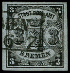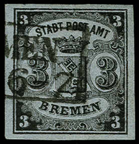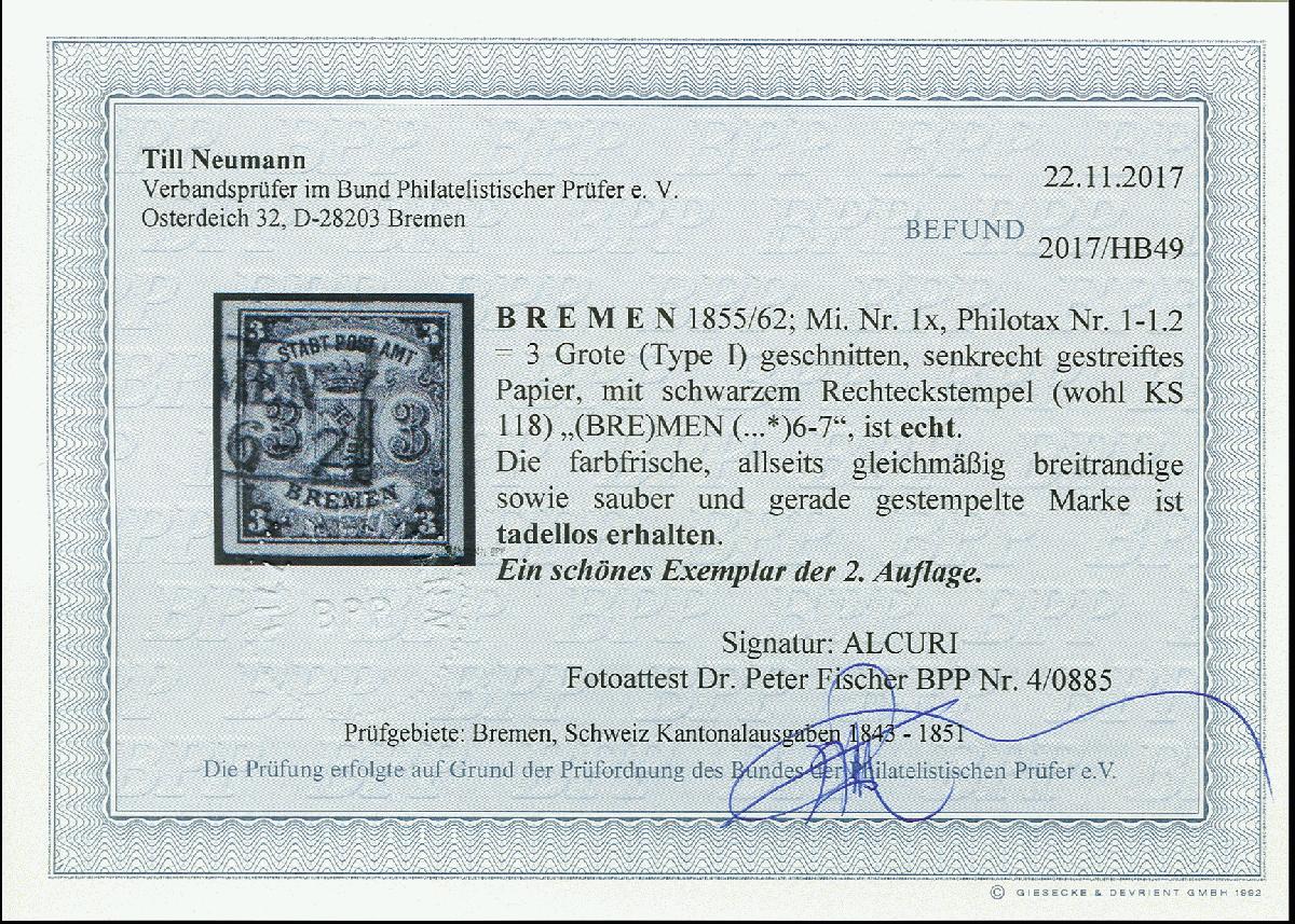 | Zusatzinformationen und Suchstichworte: | 366. Auktion Heinrich Köhler Auktionstermin 19.–24.03.2018 Los 2958 3 Gr. auf blaugrau, senkrecht gestreiftes Papier, allseits breitrandig, sauber gestempelt, schönes und tadelloses Stück der 2. Auflage, sign. Alcuri, Fotoattest Dr. Fischer BPP (1985) und Fotobefund Neumann BPP Zuschlag 320,00 EUR |