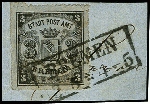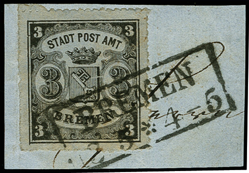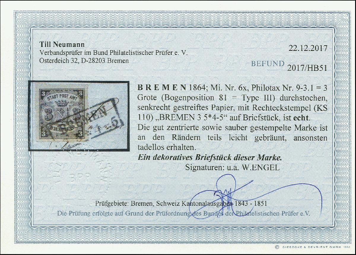 | Zusatzinformationen und Suchstichworte: | 366. Auktion Heinrich Köhler Auktionstermin 19.–24.03.2018 Los 2961 3 Gr. auf blaugrau, senkrecht gestreiftes Papier mit Ra2 "BREMEN 3. 5." auf Briefstück, die Marke ist an den Rändern teils leicht gebräunt, ansonsten tadellos und dekorativ, sign. u.a. W. Engel, Fotobefund Neumann BPP Zuschlag 190,00 EUR |