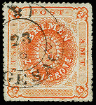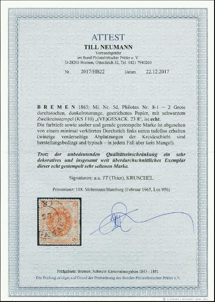 | Zusatzinformationen und Suchstichworte: | 366. Auktion Heinrich Köhler Auktionstermin 19.–24.03.2018 Los 2962 1863, Durchstochene Ausgaben 2 Gr. dunkelrotorange auf gestrichenem Papier, sehr schön farbfrisch und abgesehen von einem minimal verkürztem Durchstich links unten in völlig tadelloser Erhaltung, leicht und sauber entwertet mit dem kleinen DKr. "VEGESACK 23/8", Liebhaberstück, sign. Thier und Kruschel sowie Fotoattest Neumann BPP (2017) Provenienz: 118. Mohrmann (Hamburg)-Auktion (1965) Zuschlag 1.800,00 EUR |