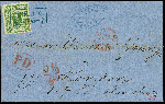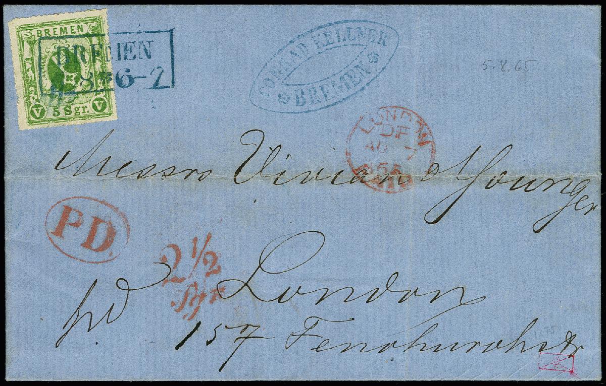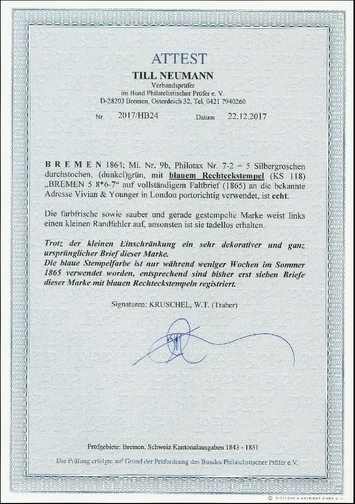 | Zusatzinformationen und Suchstichworte: | 366. Auktion Heinrich Köhler Auktionstermin 19.–24.03.2018 Los 2964 1863, 5 Sgr. grün, durchstochen, farbfrisch und bis auf kleinen Randfehler links in einwandfreier Erhaltung, mit klar aufgesetztem blauem Ra2 "BREMEN 5 8" (1865) auf kpl. Faltbrief nach London, frische und ursprüngliche Erhaltung; eine der schönsten Briefe mit dem Stempel in blauer Farbe, der nur wenige Wochen im Sommer 1865 verwendet wurde und von dem bisher nur 7 Briefe registriert wurden, sign. Traber und Kruschel sowie Fotoattest Neumann BPP (2017) Zuschlag 800,00 EUR |