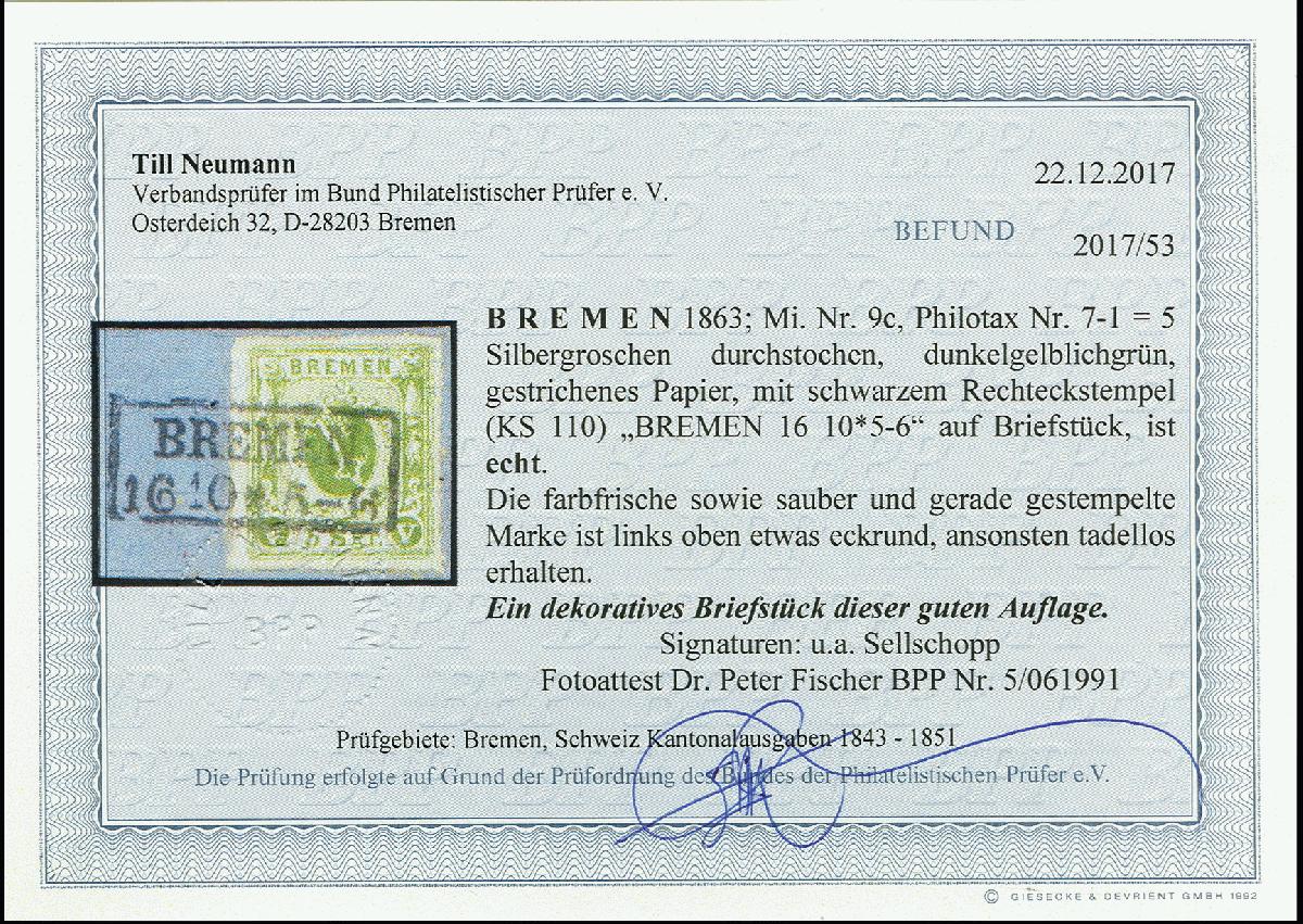 | Zusatzinformationen und Suchstichworte: | 366. Auktion Heinrich Köhler Auktionstermin 19.–24.03.2018 Los 2965 5 Sgr. dunkelgelblichgrün auf gestrichenem Papier mit Ra2 "BREMEN 16.10." auf Briefstück, die Marke ist links oben etwas eckrund, ansonsten tadelloses und dekoratives Stück dieser guten Auflage, Fotoattest Dr. Fischer BPP (1991) und Fotoattest Neumann BPP Zuschlag 190,00 EUR |