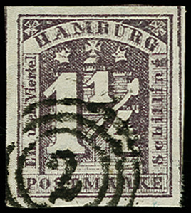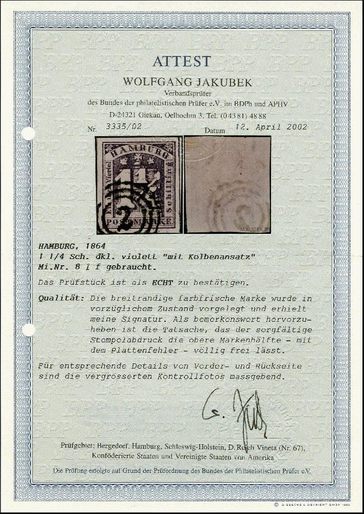 | Zusatzinformationen und Suchstichworte: | 366. Auktion Heinrich Köhler Auktionstermin 19.–24.03.2018 Los 2971 1864, 1¼ S. dunkelviolett, farbfrisch und allseits breitrandig mit Plattenfehler "Kolbenansatz", sauber mit Nr. "2" entwertet, Kabinett, sign. Jakubek BPP mit Fotoattest (2002) Zuschlag 400,00 EUR |