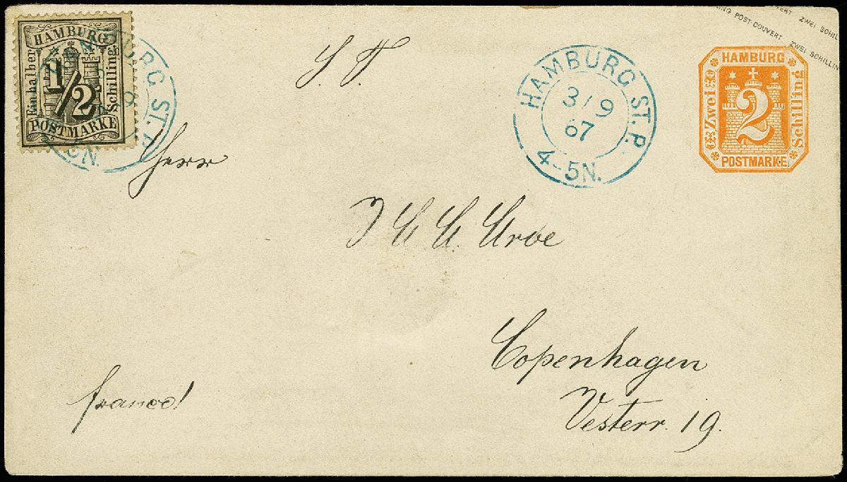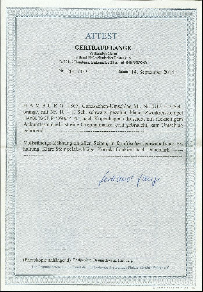 | Zusatzinformationen und Suchstichworte: | 366. Auktion Heinrich Köhler Auktionstermin 19.–24.03.2018 Los 2972 ½ Sch. schwarz, farbfrisch und gut gezähnt mit sauber auf- und nebengesetztem DKr. "HAMBURG ST.P. 3/9 67" als Zufrankatur auf Ganzsachenumschlag 1867, 2 Sch. orange nach Kopenhagen mit rückseitigem Ankunftsstempel; eine schöne Kombination in einwandfreier Erhaltung, Fotoattest Lange BPP (2014 Ausruf 600,00 EUR |