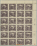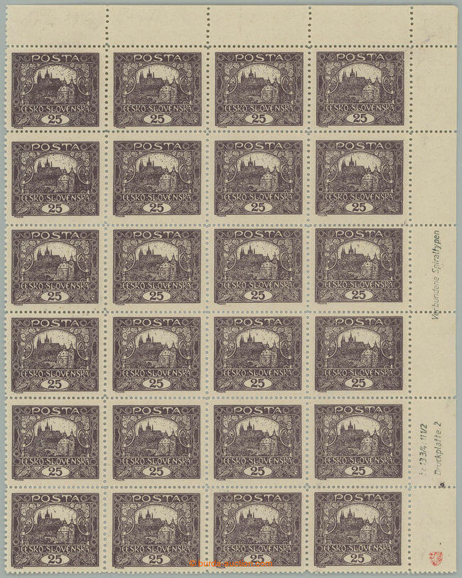 | Zusatzinformationen und Suchstichworte: | Burda 69. Auktion 10. - 11. September 2022 Los 2208 Tschechoslowakei 1918-1939 Pof. 11Fb, 25h brownlila, UR Ecke blk-of-24 mit Linienzähnung 13¾ : 11½ ab II. Druckplatte, enthält 3x Typenkombination spiralförmigem und 4x Balken Typ (!) spiralförmigem Type I auf Pos. 10, 27 und 59, Balken Typ II auf Pos. 7,8,40 und 49; kleiner Falz auf/für Ecke stmp, Attest Vrba, vorne hochkant gekennzeichnet gezähnt und Platte (Miltner), außergewöhnlich Einheit mit beigetreten Typen ex Wilhelms, passendem zu jeder groß Spezialsammlung Hradcany! Zuschlag 1.920,00 EUR |