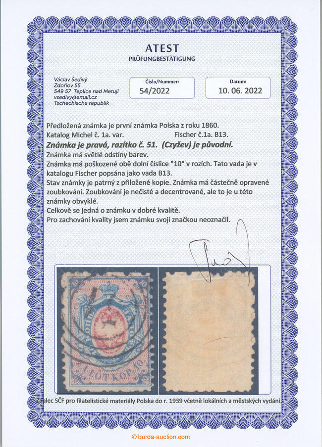 | Zusatzinformationen und Suchstichworte: | Burda 69. Auktion 10. - 11. September 2022 Los 291 Polen 1860 Mi. 1, Wappen 10kop mit seltenerer gerundet Poststempel 51 - Czyzew, zuzüglich mit Plattenabart Fischer B13 - geschädigte beide die unten Ziffern in Ecken; insgesamt fein Briefstücks mit Attest Sedivy (Föderation von tschechische Briefmarkensammler), selten! Zuschlag 320,00 EUR |