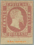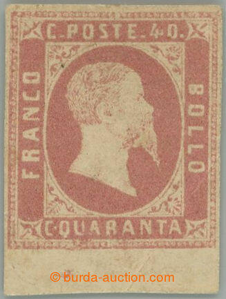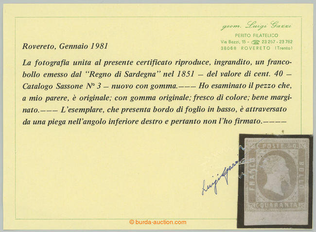 | Zusatzinformationen und Suchstichworte: | Burda 69. Auktion 10. - 11. September 2022 Los 81 Italien Staaten Sardinien 1851 Sass. 3, Viktor Emmanuel II. 40c rosa, ungebraucht Briefstücks mit Unterrand (!) breit gerandet; Originalgummi mit Falzrest, richtigem niedriger Schrägstrich Knick, Attest Gazzi, c. v. 45,000EUR + +, selten Klassikmarke! Ausruf 1.600,00 EUR |