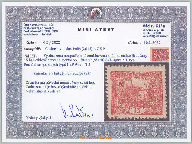 | Zusatzinformationen und Suchstichworte: | Burda 69. Auktion 10. - 11. September 2022 Los 2192 Tschechoslowakei 1918-1939 Pof. 7E ist, 15h wie ein Ziegel rot, gezähnt Linienzähnung 11½ : 10¾, spiralförmigem Typ (!) Pos. 94, Platte 1; kleiner Falz, L stumpfe Ecke, ohne Vermerke, in Attest Kana deklarierter als postfrisch, sehr gesucht Briefmarke! Zuschlag 600,00 EUR |