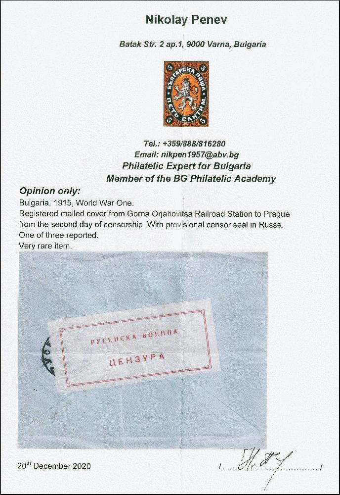 | Zusatzinformationen und Suchstichworte: | Heinrich Köhler 379. Auktion 19. - 24. September 2022 Los 1004 Bulgarien "RUSENSKA MILITARY CENSOR", large sensor label on reverse of registered envelope from Gorna Orjahovitsa Railroad Station to Prague. One of 3 reported. Opinion Penev. Ausruf 300,00 EUR |