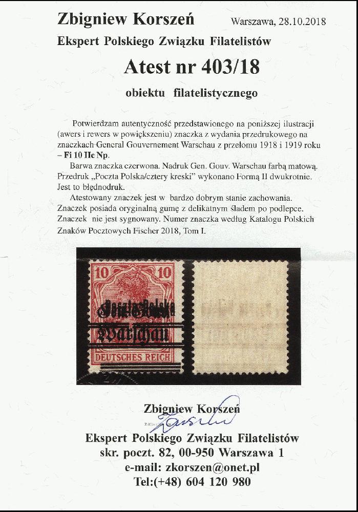 | Zusatzinformationen und Suchstichworte: | Heinrich Köhler 379. Auktion 19. - 24. September 2022 Los 1301 Polen 1918, Germania 10 pfg. with clear double overprint, unused, very fine, scarce, certificate Korszen (2018) and Petriuk PZF (2021) (Fischer 10II Np) Zuschlag 250,00 EUR |