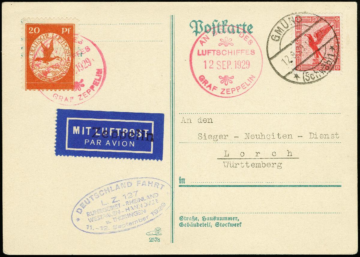 | Zusatzinformationen und Suchstichworte: | 366. Auktion Heinrich Köhler Auktionstermin 19.–24.03.2018 Los 1274 1929, Deutschlandfahrt, Abwurf Schwäbisch Gmünd, Karte mit Bordstempel vom 12.9. und Adler 15 Pfg. mit Stempel "GMÜND 12.9.29" und zusätzlich alte Flugpostmarke Rhein/Main 20 Pfg. mit Bordstempel-Entwertung, adressiert nach Lorch, Pracht, sehr seltener Abwurf, sign. Aisslinger BPP mit Fotoattest Zuschlag 700,00 EUR |