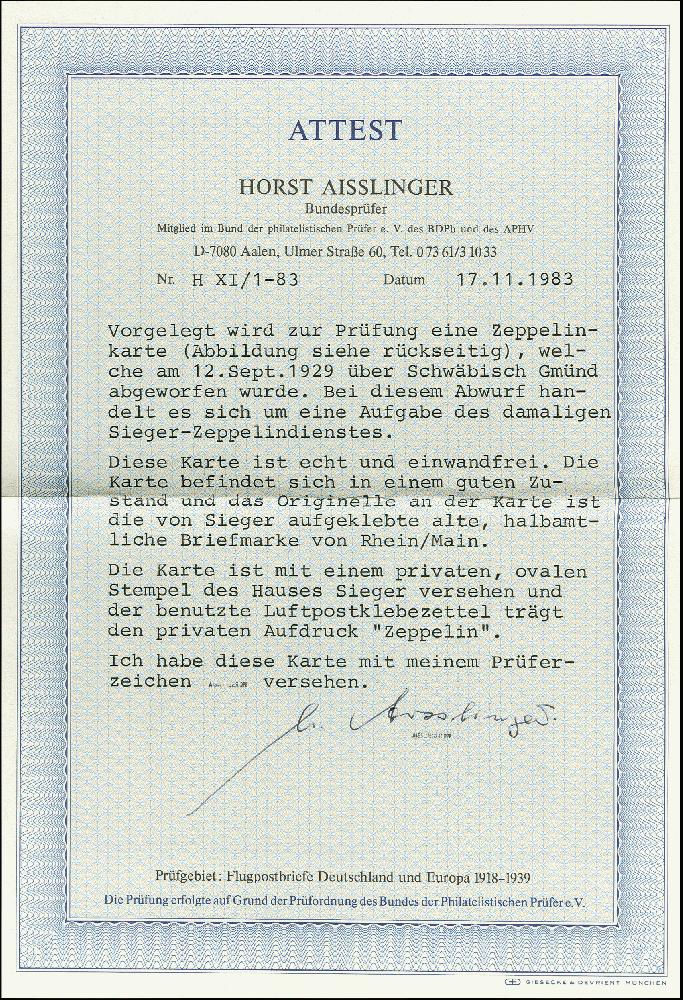 | Prüfgebiet: | Deutsches Reich Zeppelinpost (Belege) |